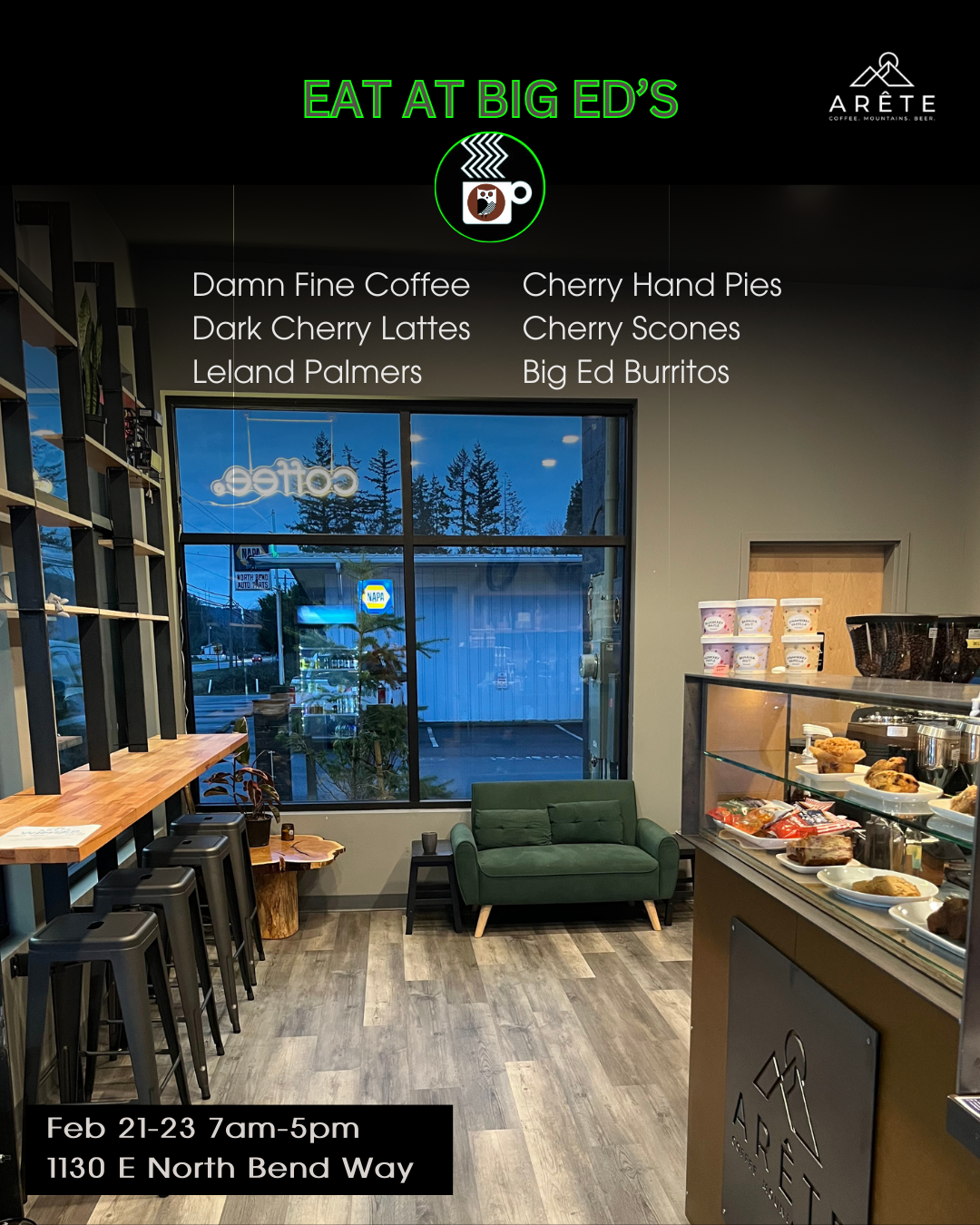 Big Ed’s Gas Farm sign will be available February 21-23 at The Line: 1130 E North Bend Way. Stop by for themed menu items from Arete cafe all day, and Happy Hour by the fire pit each afternoon. Contact experience@theline.bike with questions.